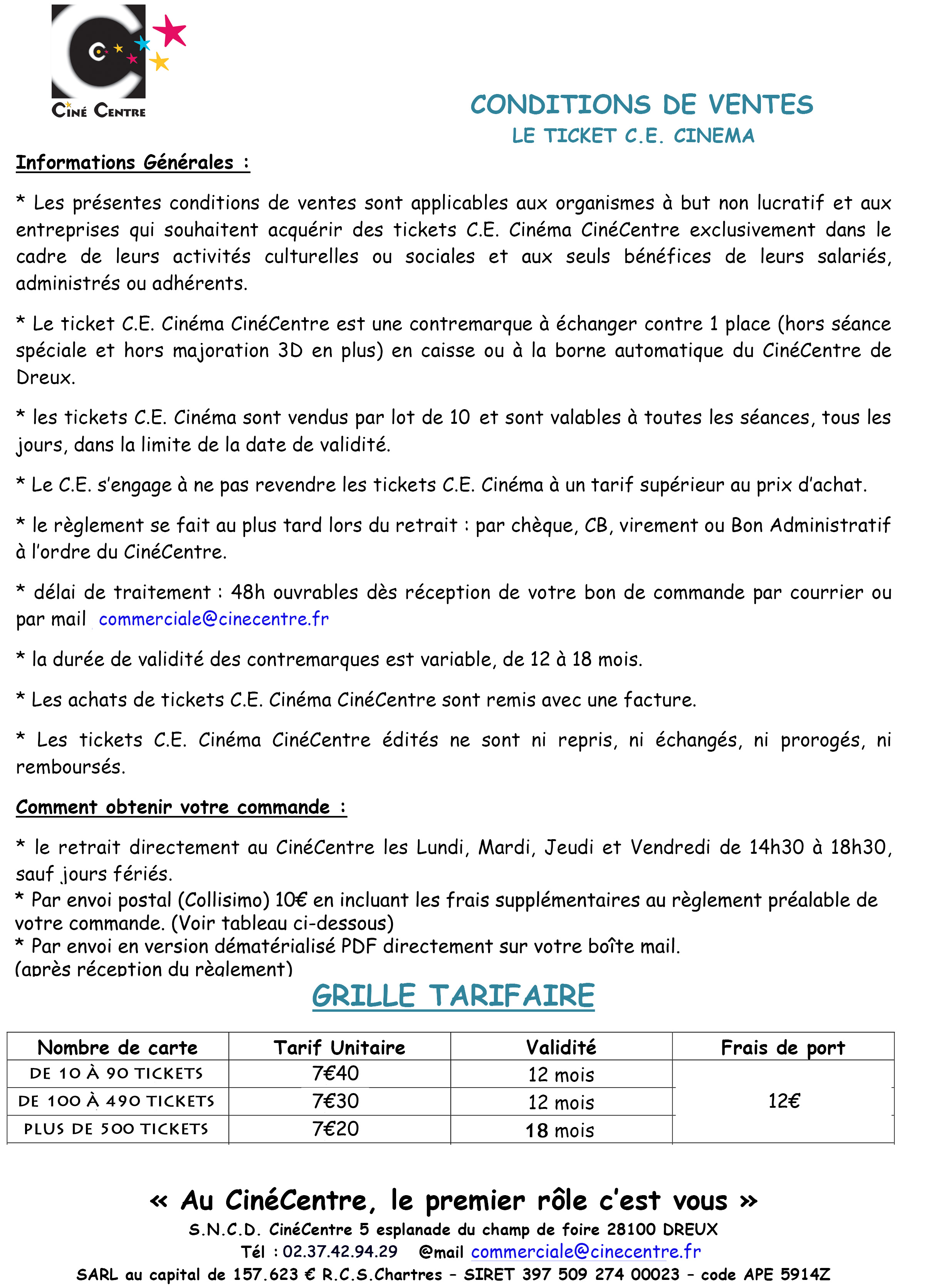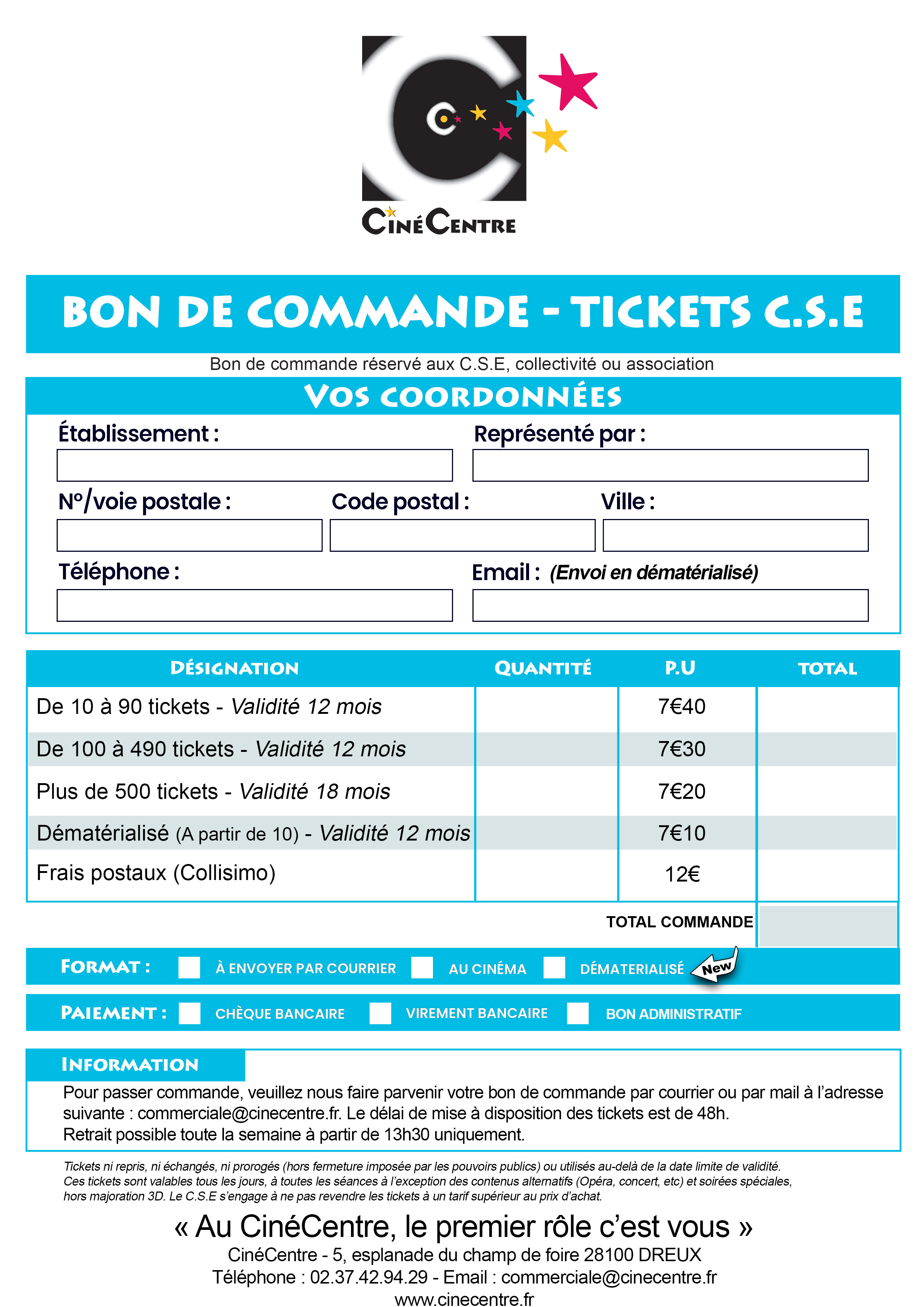 Nous rendons le processus de commande aussi simple que possible pour vous. Vous avez la possibilité de télécharger le bon de commande directement sur notre site internet ou de le demander par email. Nous proposons désormais des billets de cinéma dématérialisés pour plus de praticité et de flexibilité.